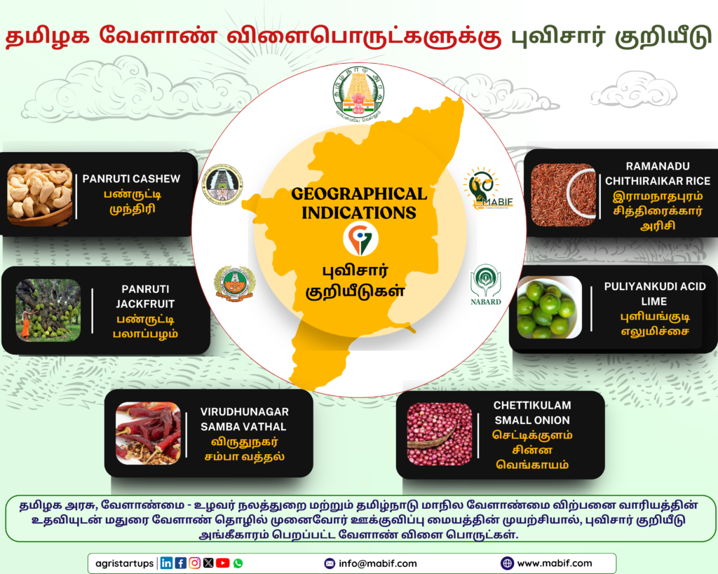 தமிழக அரசால், தமிழகத்தின் பாரம்பரிய வேளாண் விளைபொருட்களுக்கு புவிசார் குறியீடு (GI) அங்கீகாரம் பெறுவதற்கான முயற்சிக்கு மாபெரும் உந்துதல் அளிக்கப்பட்டது. வேளாண்மை – உழவர் நலத்துறை மற்றும் தமிழ்நாடு மாநில வேளாண்மை விற்பனை வாரியத்தின்(TANSAMB) உதவியுடன் மதுரை வேளாண் தொழில் முனைவோர் ஊக்குவிப்பு மையம் (MABIF), புவிசார் குறியீடு பெறுவதற்கு பல்வேறு முயற்சிகளை மேற்கொண்டது.