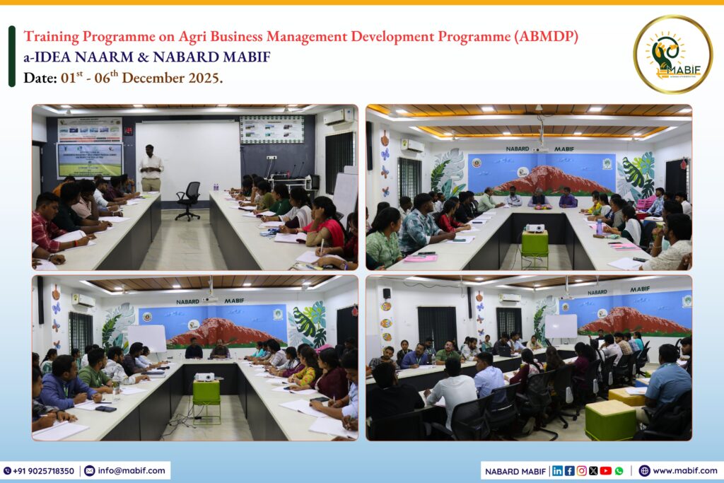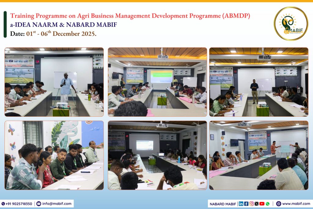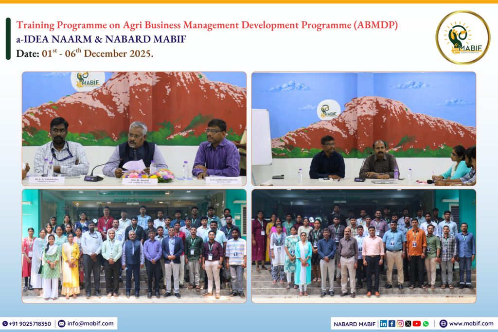 a-IDEA, ICAR-NAARM, in collaboration with NABARD MABIF (an initiative of NABARD & TNAU), jointly organizing the Agri business Management Development Program for Prospective CEOs of FPOs (ABMDP) – Tamil Nadu, a 60 days capacity-building initiative, with the first six days of training conducted at MABIF from 01st to 06th December 2025. The programme was designed to enhance the managerial, legal and organizational skills of students and prepare them for CEO-level roles in Farmer Producer Organizations (FPOs), CBBOs, NGOs and agri-startups.