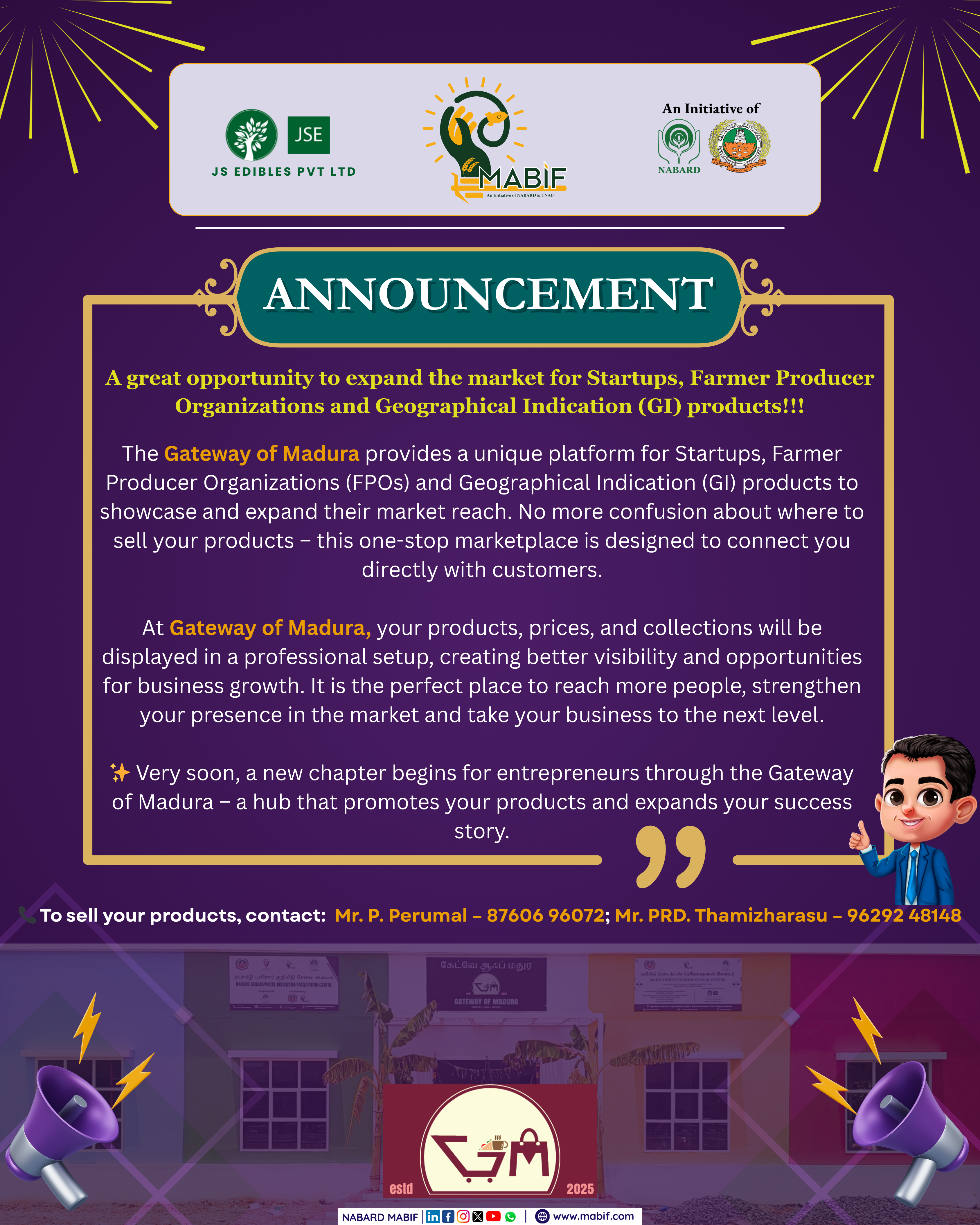 A great opportunity to expand the market for Startups, Farmer Producer Organizations and Geographical Indication (GI) products!!! The Gateway of Madura is here to showcase