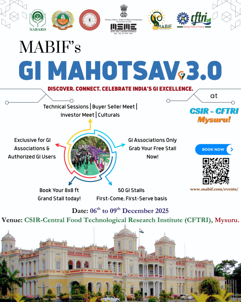 NABARD MABIF is delighted to announce the “GI Mahotsav 3.0”, organized in collaboration with the Ministry of Micro, Small and Medium Enterprises, Government of India, NABARD – National Bank for Agriculture and Rural Development, Tamil Nadu Agricultural University and CSIR−Central Food Technological Research Institute (CFTRI). This grand 4-days event is scheduled to take place from 06th to 09th December 2025 at the CSIR−Central Food Technological Research Institute (CFTRI), Mysuru.