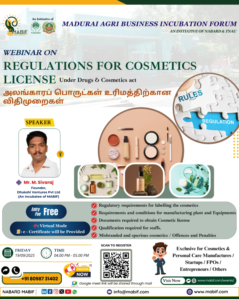 Join our free webinar, “Regulations for Cosmetics License under Drugs & Cosmetics Act,” hosted by Madurai Agri Business Incubation Forum (NABARD MABIF), an initiative of NABARD & TNAU.