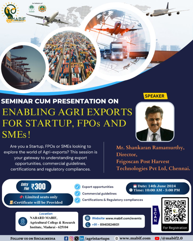 MABIF is excited to announce a seminar cum presentation on “Enabling Agri Exports for Startups, FPOs and SMEs” on 14th June 2024 at MABIF, AC&RI, Madurai.