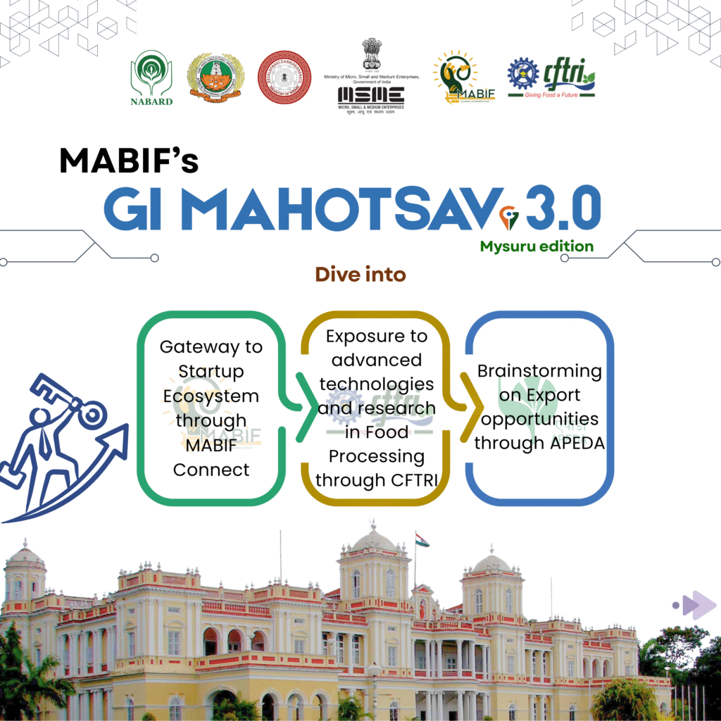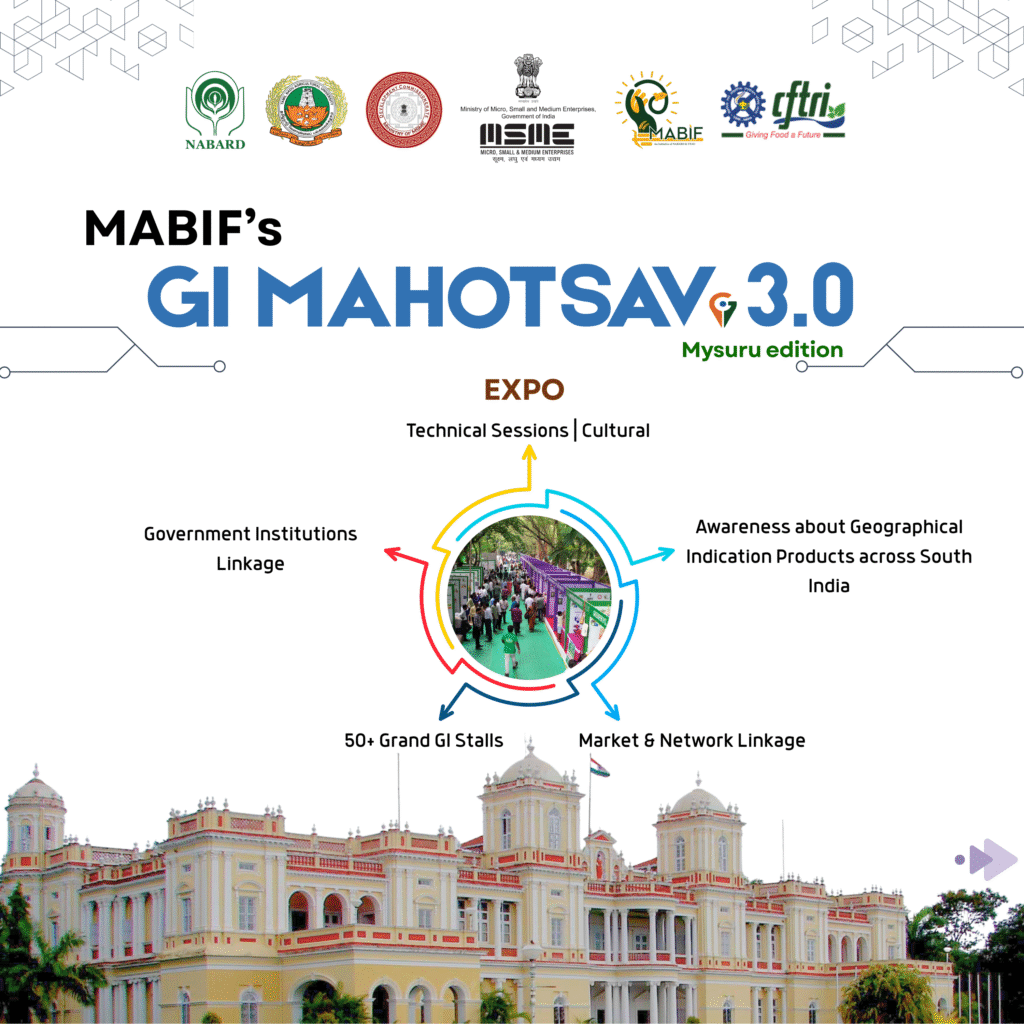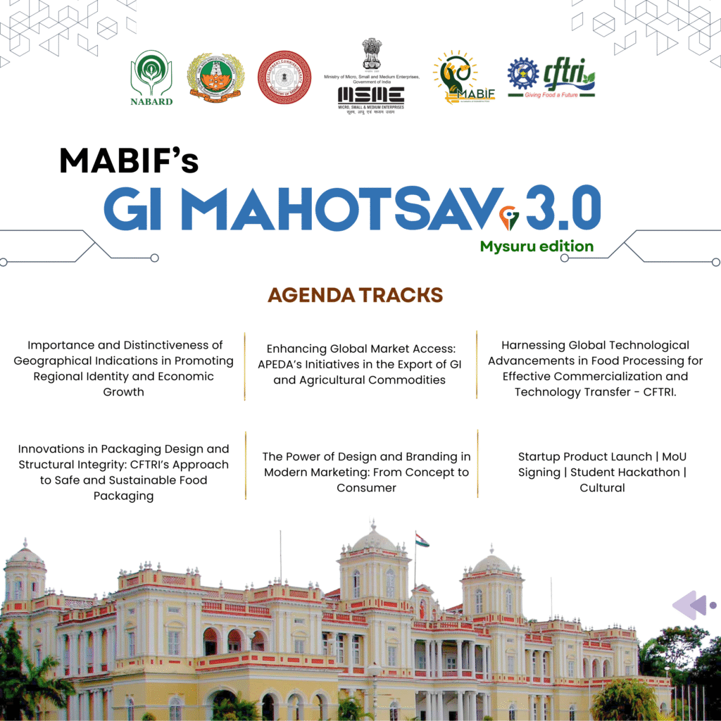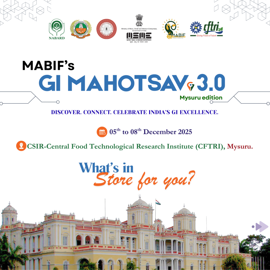 Join us for “GI Mahotsav 3.0”, organized in collaboration with the Ministry of Micro, Small and Medium Enterprises, Government of India, NABARD – National Bank for Agriculture and Rural Development, Tamil Nadu Agricultural University and CSIR−Central Food Technological Research Institute (CFTRI). This grand 4-days event is scheduled to take place from 05th to 08th December 2025 at the CSIR−Central Food Technological Research Institute (CFTRI), Mysuru.