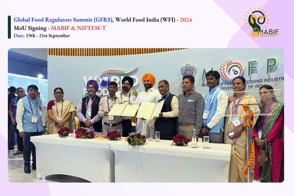 Madurai Agribusiness Incubation Forum (NABARD MABIF) has signed a MoU with the National Institute of Food Technology, Entrepreneurship and Management – Thanjavur (NIFTEM-T) in the presence of Hon’ble Union Minister of State Shri Ravneet Singh Bittu, Ministry Of Food Processing Industries, Government Of India at World Food India 2024. This collaboration is designed to promote innovation, research and entrepreneurship within the agri-food sector. MABIF exchanges MoU with Dr. Palanimuthu, Director, NIFTEM-T in the presence of delegates.