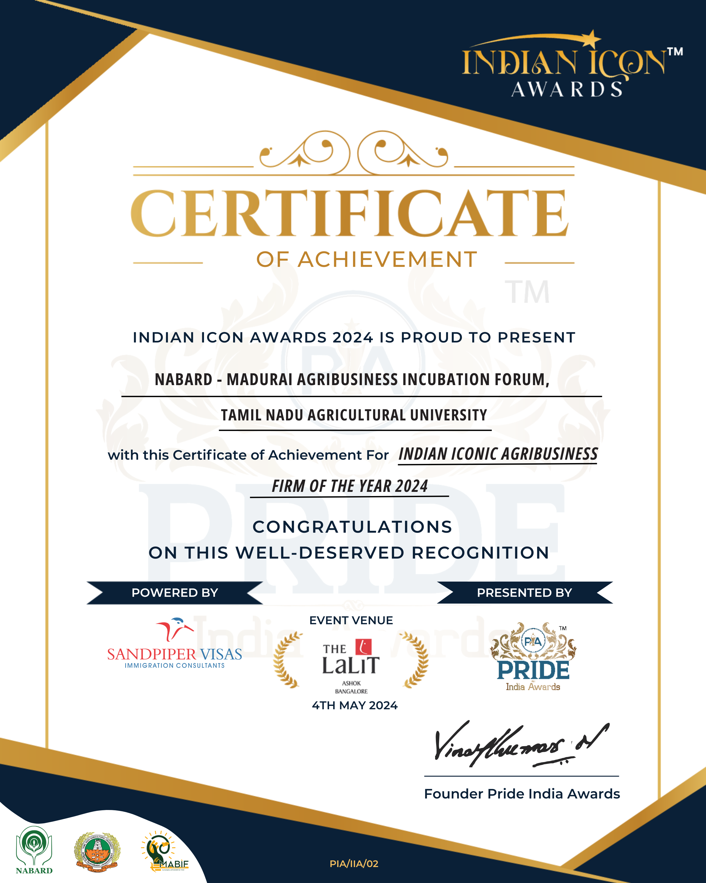 We extend our thanks and gratitude to NABARD – National Bank for Agriculture and Rural Development and Tamil Nadu Agricultural University Officials, including NABARD Chairman Shri. Shaji K.V, Dr. V. Geethalakshmi, Vice-Chancellor-TNAU, Shri R. Anand, CGM, OFDD, NABARD HO-Mumbai, Shri. Shankar Narayan Ramanathan, CGM-NABARD RO-Chennai, Dr. E. Somasundaram, Director, DABD-TNAU, Dr. P.P. Mahendran, Dean, AC&RI-Madurai, Er. Ganesh Moorthy K, CEO, NABARD MABIF, Team MABIF, MABIF Incubatees, and all supporters for their unwavering support.