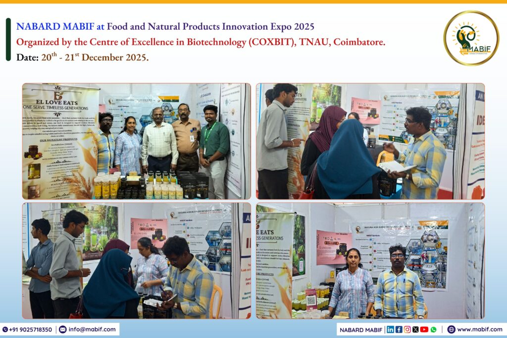 We are delighted to share that NABARD Madurai Agri Business Incubation Forum (NABARD MABIF) had a presence at “Food and Natural Products Innovation Expo 2025” organized by the Centre of Excellence in Biotechnology (COXBIT), TNAU, Coimbatore, held from 20th – 21st December 2025.
