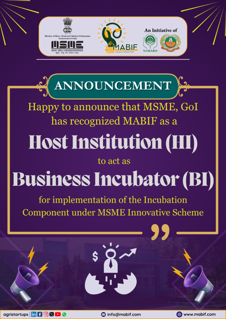 We are happy to announce that the Ministry of Micro, Small and Medium Enterprises, Government of India has recognized NABARD MABIF as a Host Institution (HI) to act as Business Incubator (BI).