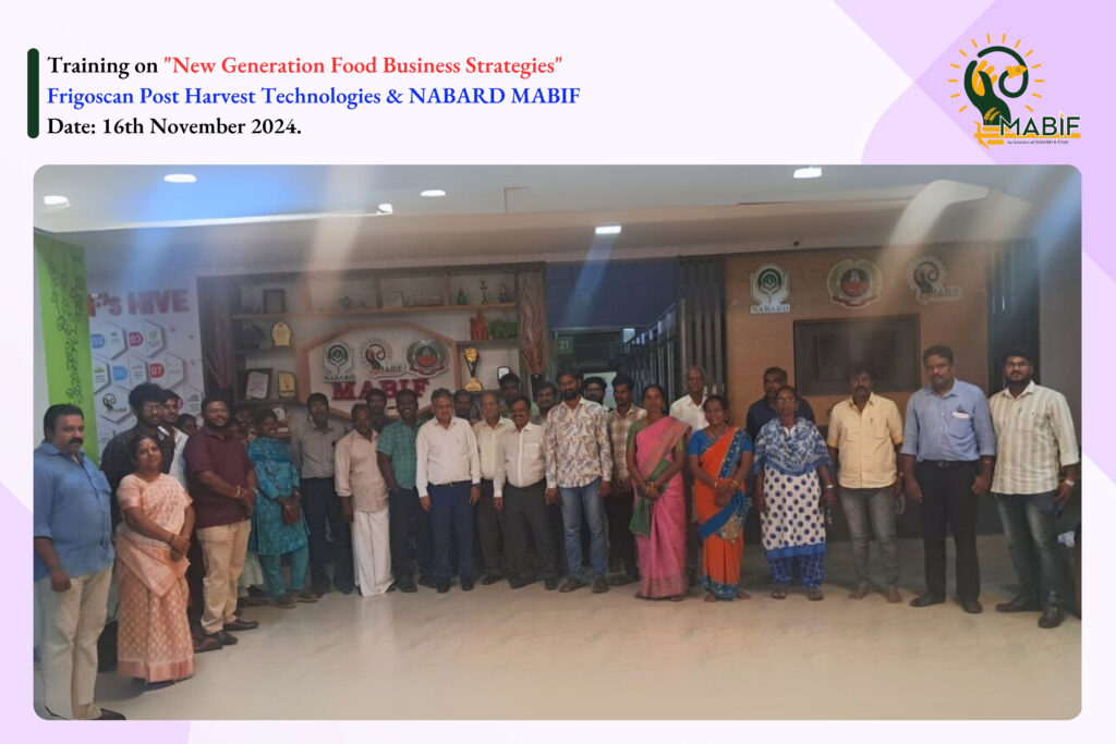 M/s. Frigoscan Post Harvest Technologies, a proud member of NABARD MABIF, conducted an insightful training session titled “New Generation Food Business Strategies” on 16th November 2024 at MABIF, bringing together innovative Agri-entrepreneurs and industry leaders to explore modern strategies for advancing the food business.