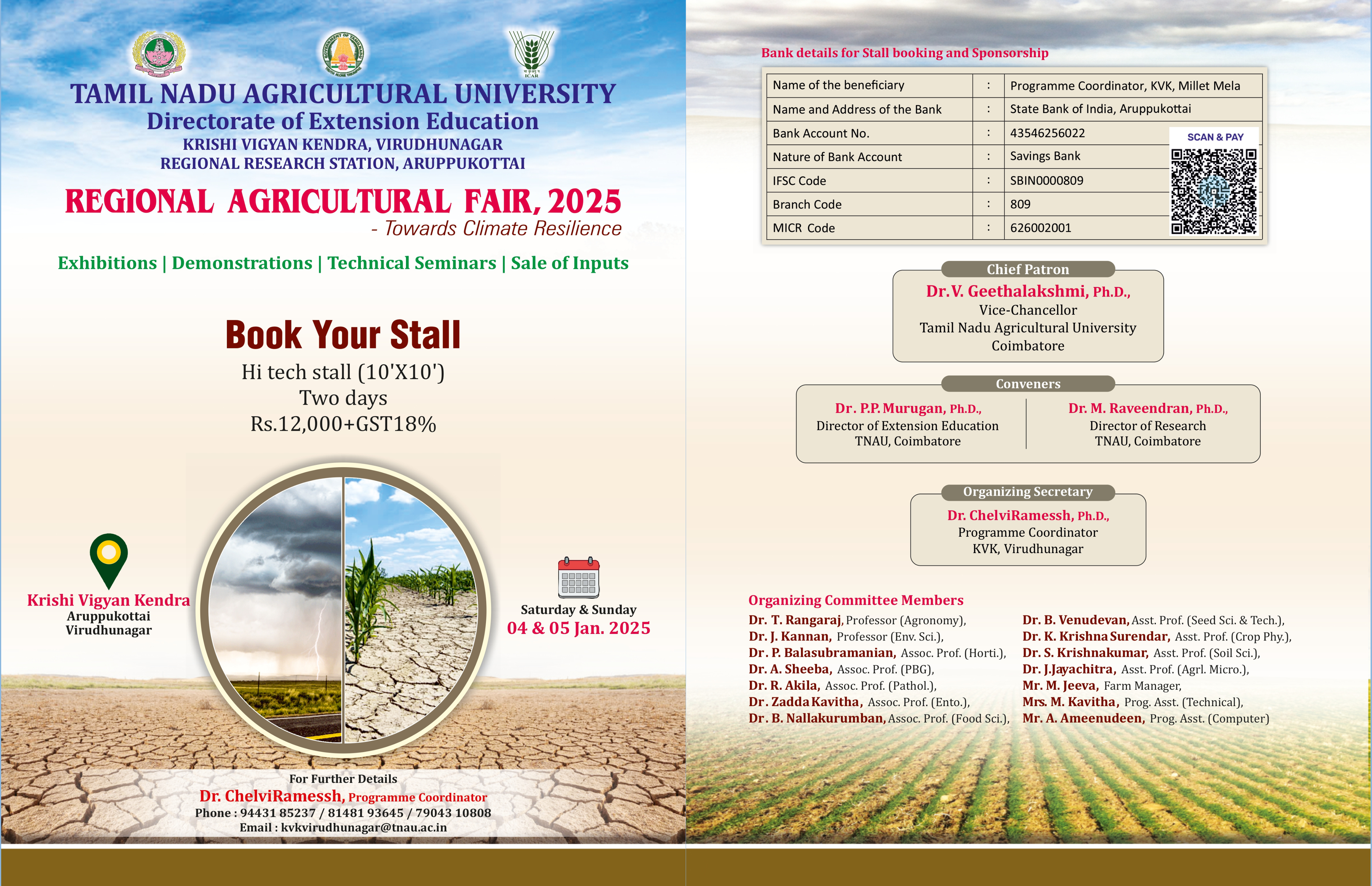 Join us for the Regional Agricultural Fair 2025 organized by Directorate of Extension Education, Tamil Nadu Agricultural University (TNAU) at the Krishi Vigyan Kendra (KVK), Virudhunagar on 04th & 05th January 2025, this is a must-attend event for anyone interested in agriculture, innovation and climate resilience.