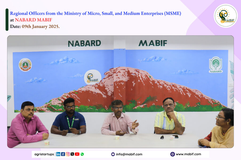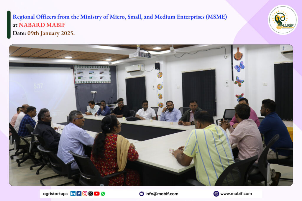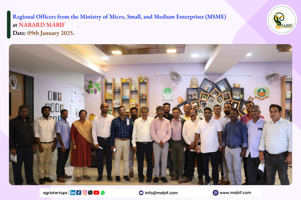 NABARD MABIF was honoured to host Regional Officers from the Ministry of Micro, Small and Medium Enterprises, Government of India on 9th January 2025. The visit aimed to explore the state-of-the-art Incubation services & IPR Services provided to startups, Farmer Producer Organizations (FPOs) and farmers.