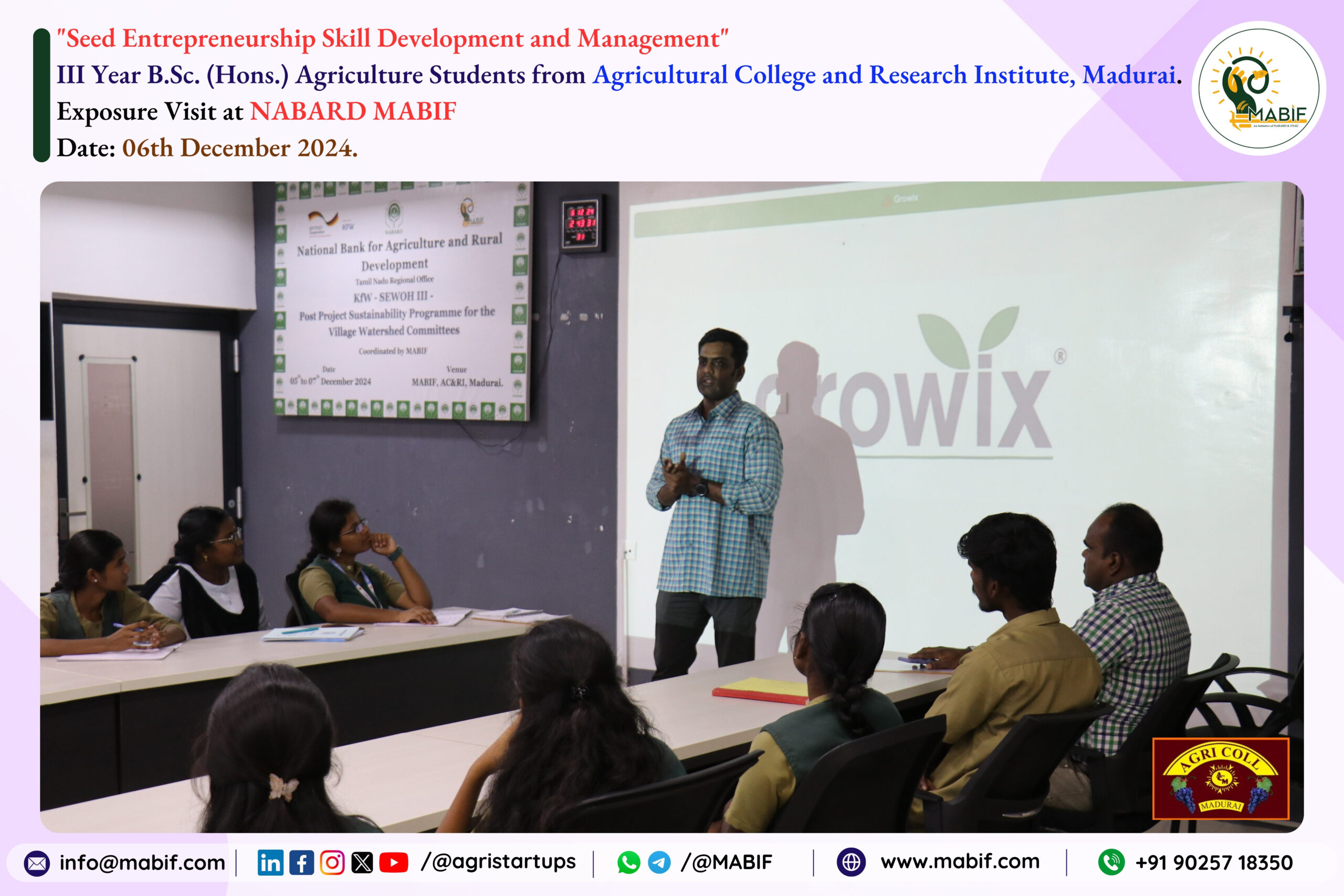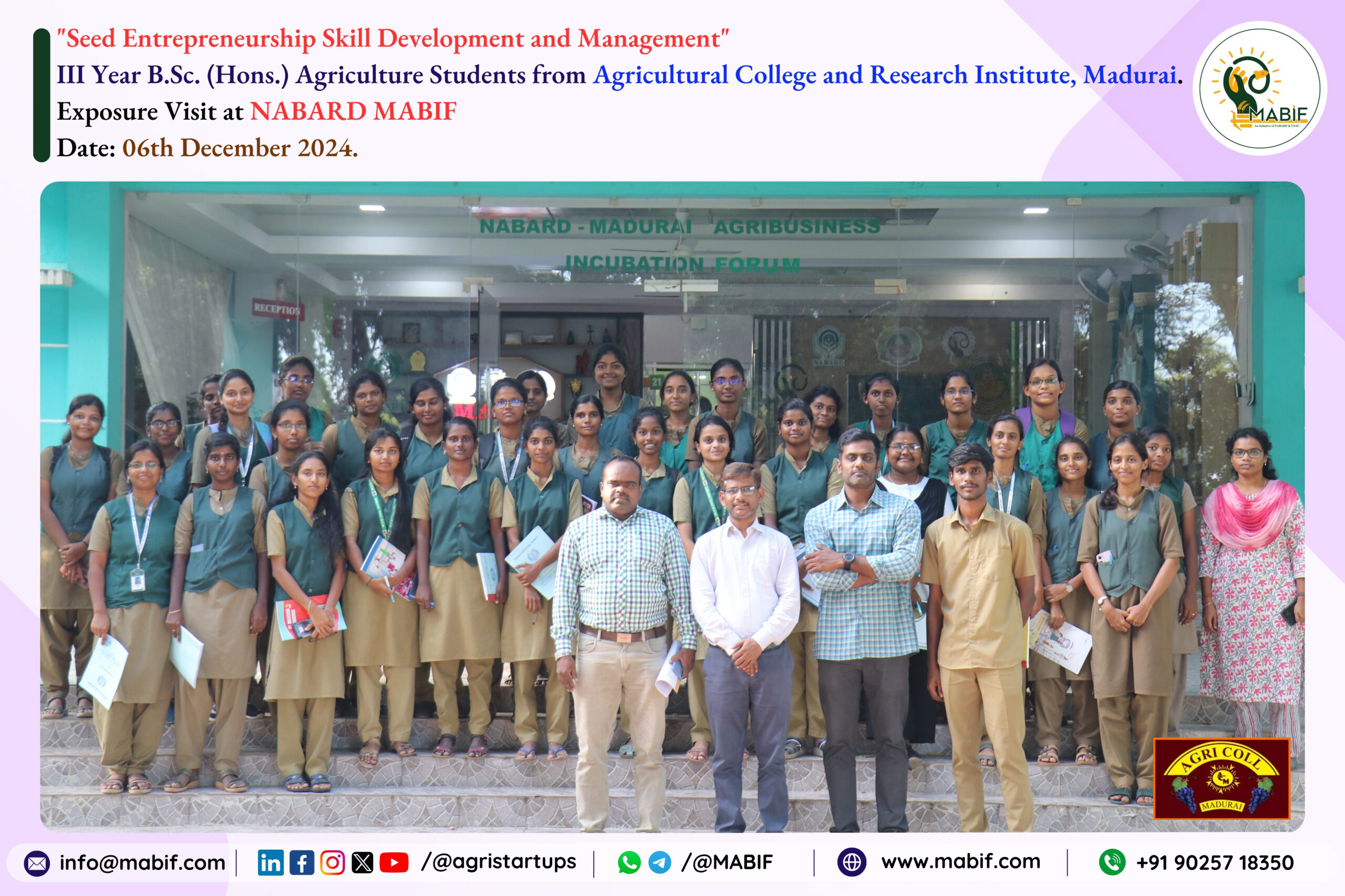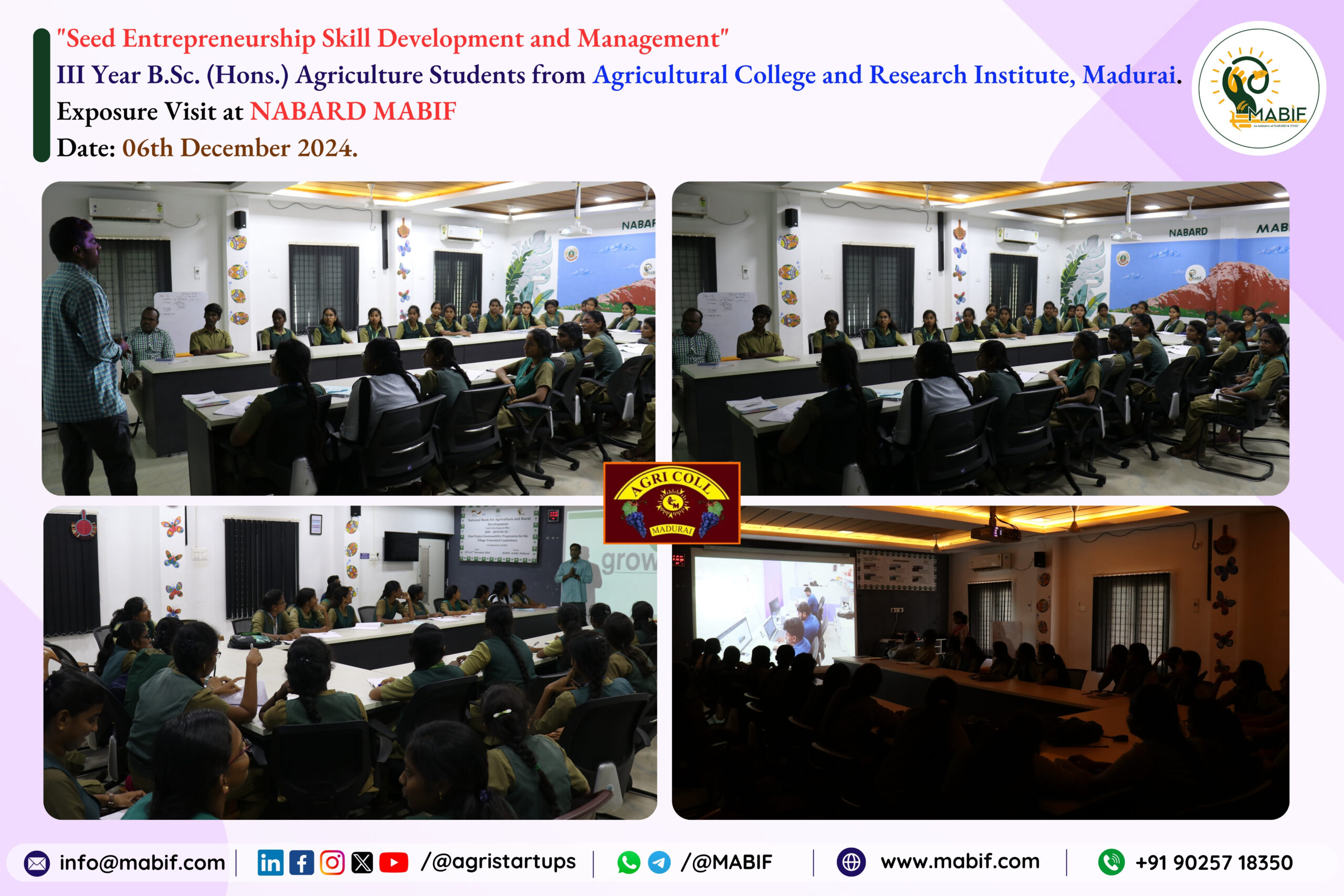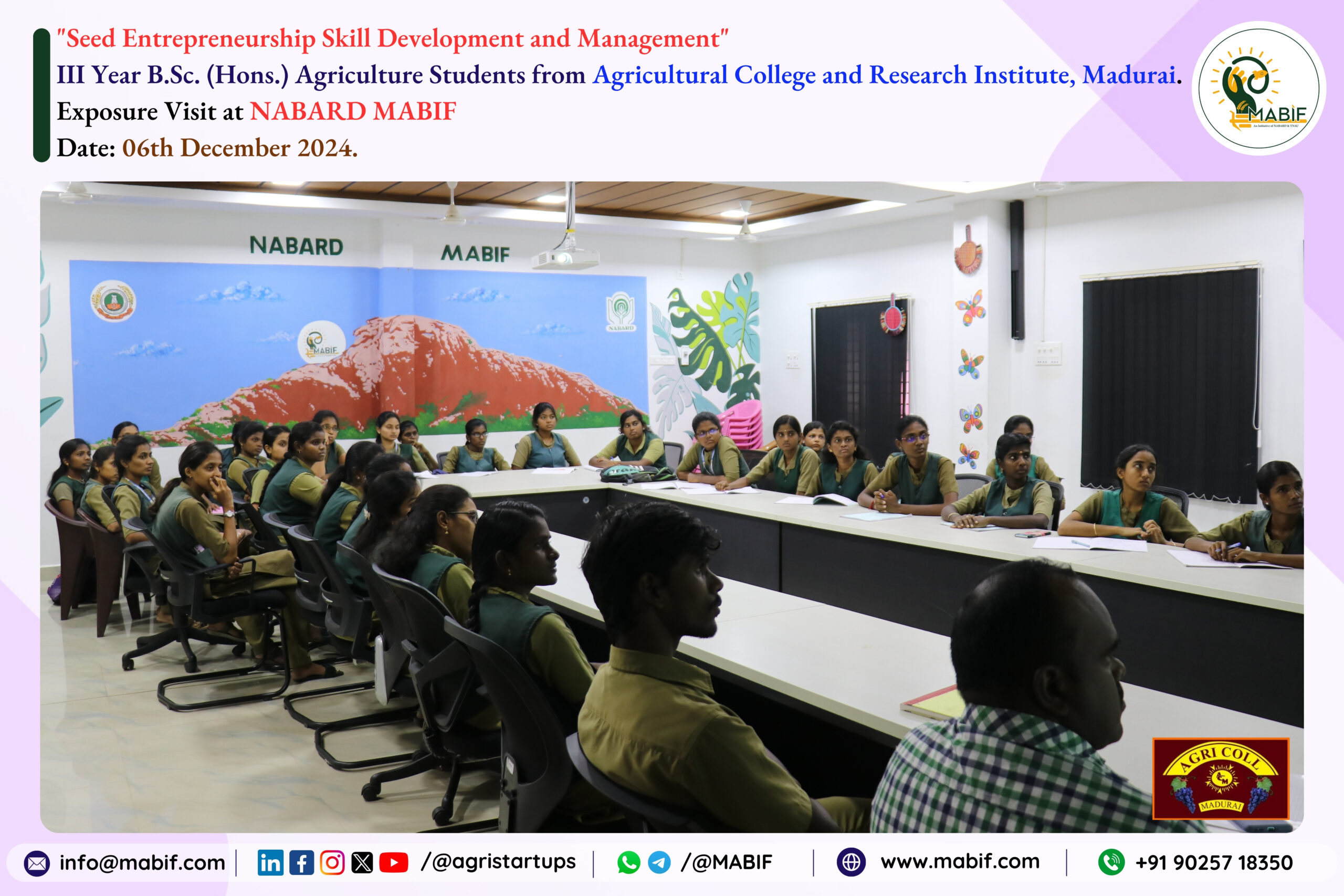 As a part of their exposure visit, III Year B.Sc. (Hons.) Agriculture students from the Department of Seed Science and Technology, Agricultural College and Research Institute, Madurai, visited MABIF as part of their course practical class on “Seed Entrepreneurship Skill Development and Management”.