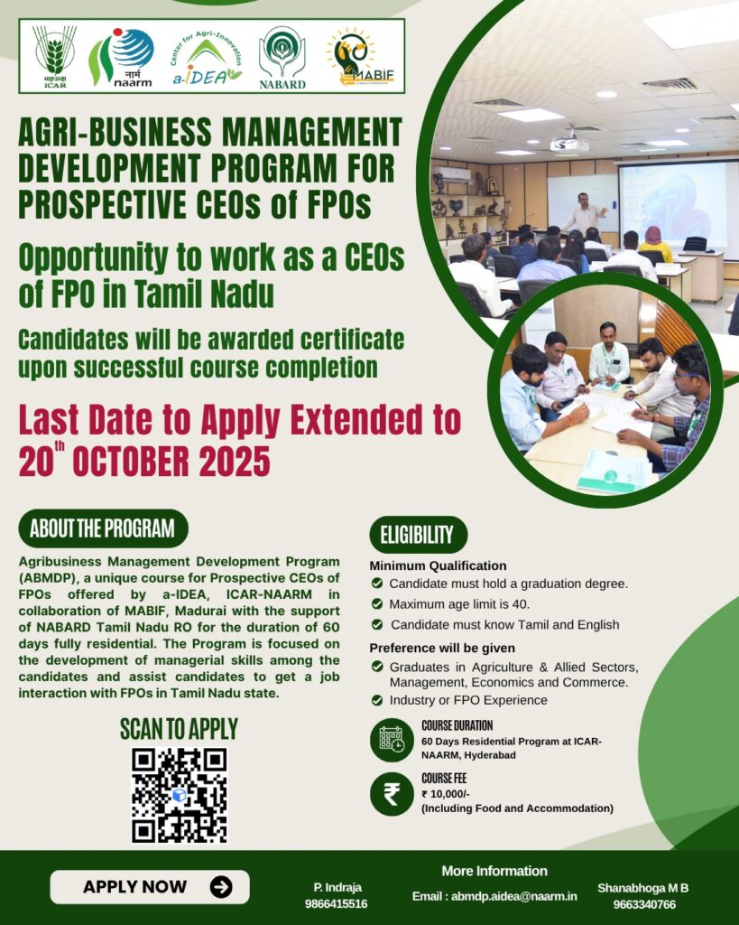 a-IDEA, ICAR-NAARM, in collaboration with NABARD Madurai Agri Business Incubation Forum (an initiative of NABARD & TNAU), is organizing the Agri-Business Management Development Program (ABMDP) – a 60-day fully residential program at ICAR–NAARM, Hyderabad, starting 1st December 2025 (tentative).
