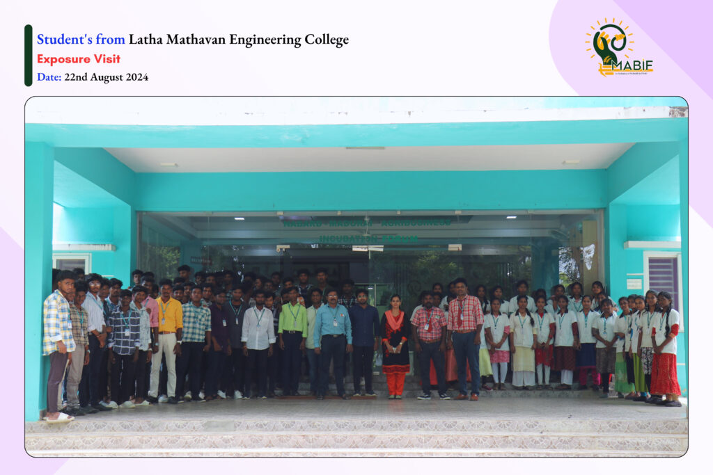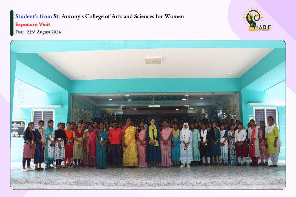 As a part of their exposure visit, students from Kalasalingam School of Agriculture and Horticulture (KSAH), Mangayarkarasi College of Arts & Science for Women, Madurai Institute of Social Sciences, Annai Vailankanni Arts And Science College, V.V.Vanniaperumal College for Women and Govt. Hr. Sec. School, Elamanur visited the MABIF, to know about the incubation centre activities towards the empowerment of startup ecosystems. MABIF explained the opportunities that are provided by the government to the startups/entrepreneurs/Farmers/FPOs for their products/services.