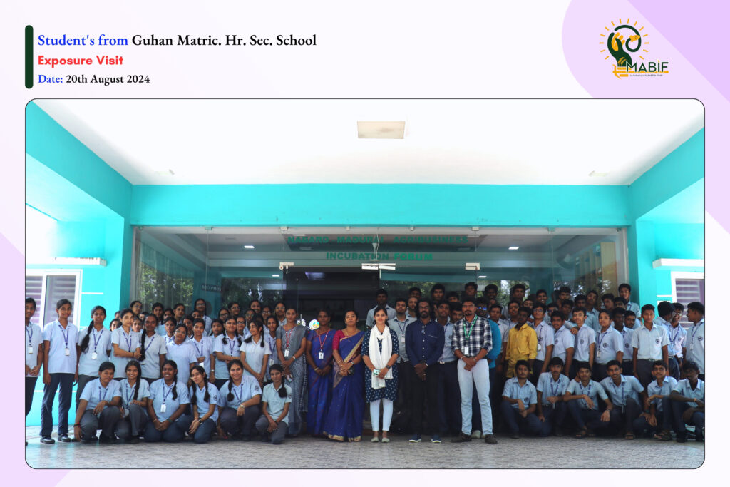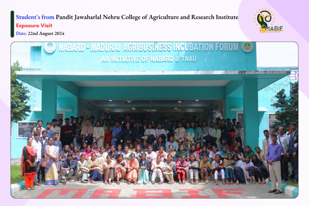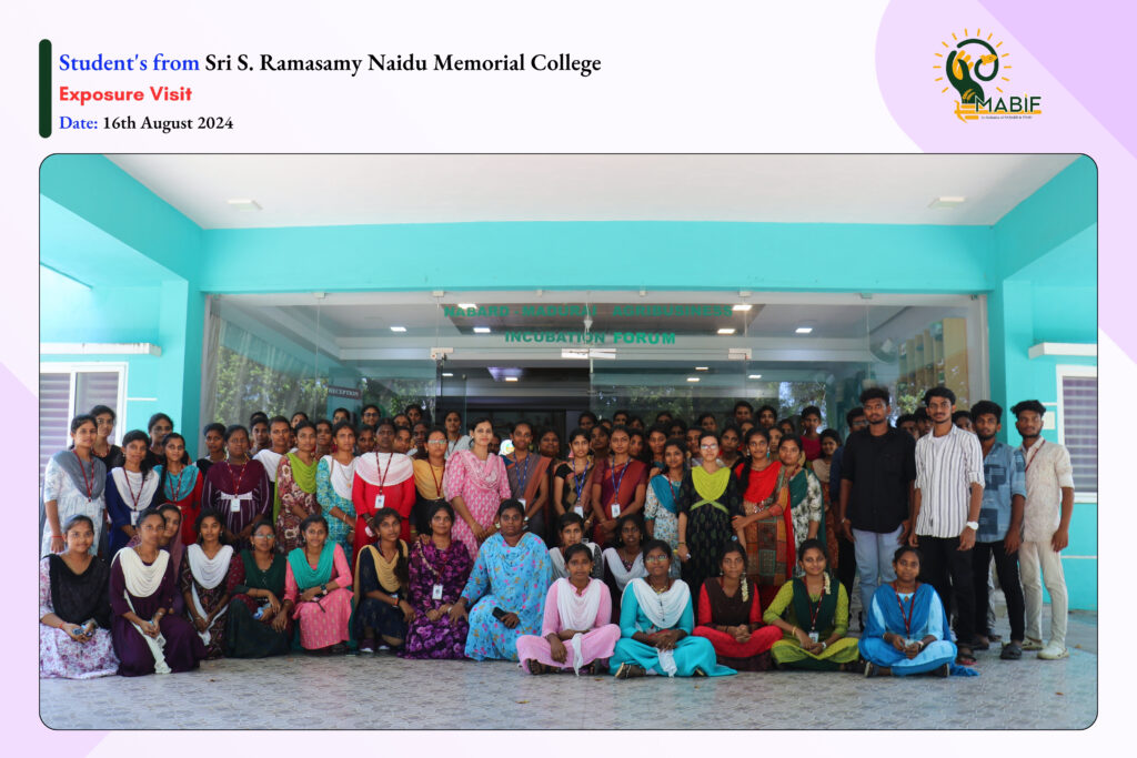 As a part of their exposure visit, students from Sri S. Ramasamy Naidu Memorial College, Guhan Matriculation Hr. Sec. School, Pandit Jawaharlal Nehru College of Agriculture and Research Institute, Latha Mathavan Engineering College and St. Antony’s College of Arts & Sciences for Women visited the MABIF, to know about the incubation centre activities towards the empowerment of startup ecosystems. MABIF explained the opportunities that are provided by the government to the startups/entrepreneurs/Farmers/FPOs for their products/services.