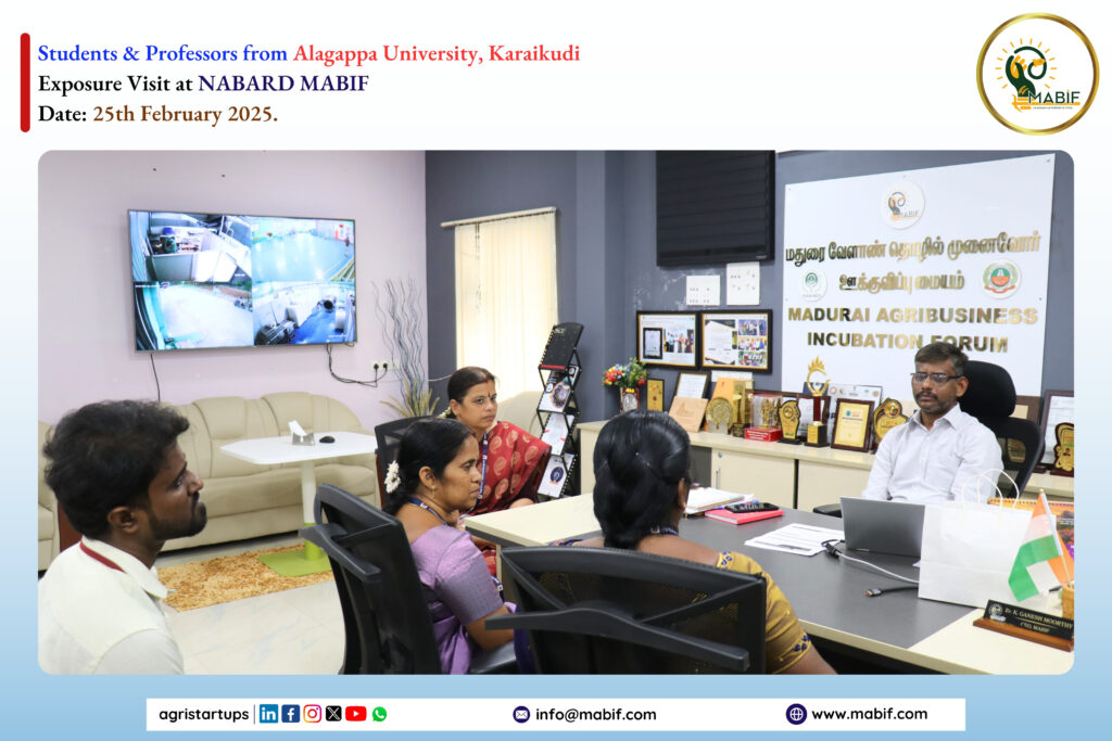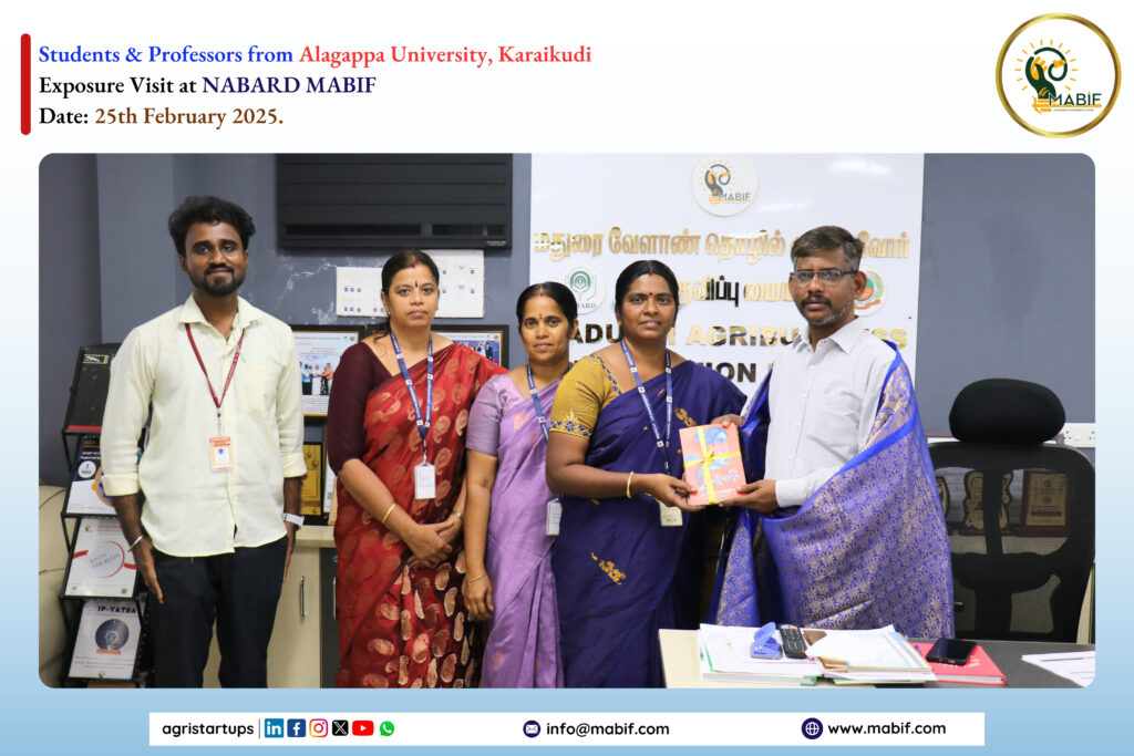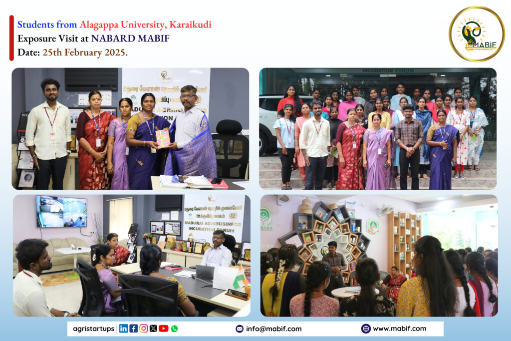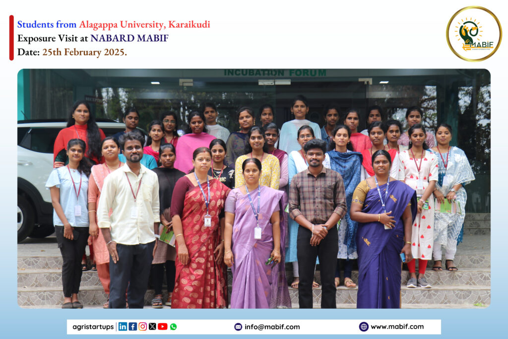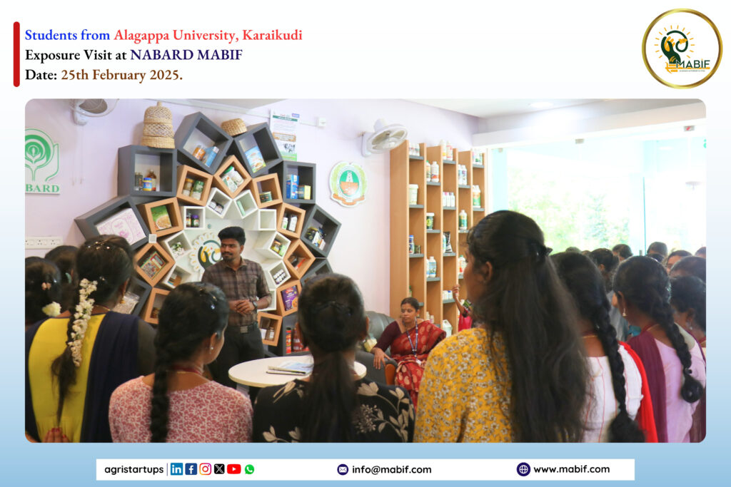 As a part of their exposure visit, Students from Alagappa University, Karaikudi visited the NABARD MABIF, to know about the incubation centre activities towards the empowerment of startup ecosystems. MABIF explained the opportunities that are provided by the government to the startups/entrepreneurs/Farmers/FPOs for their products/services.