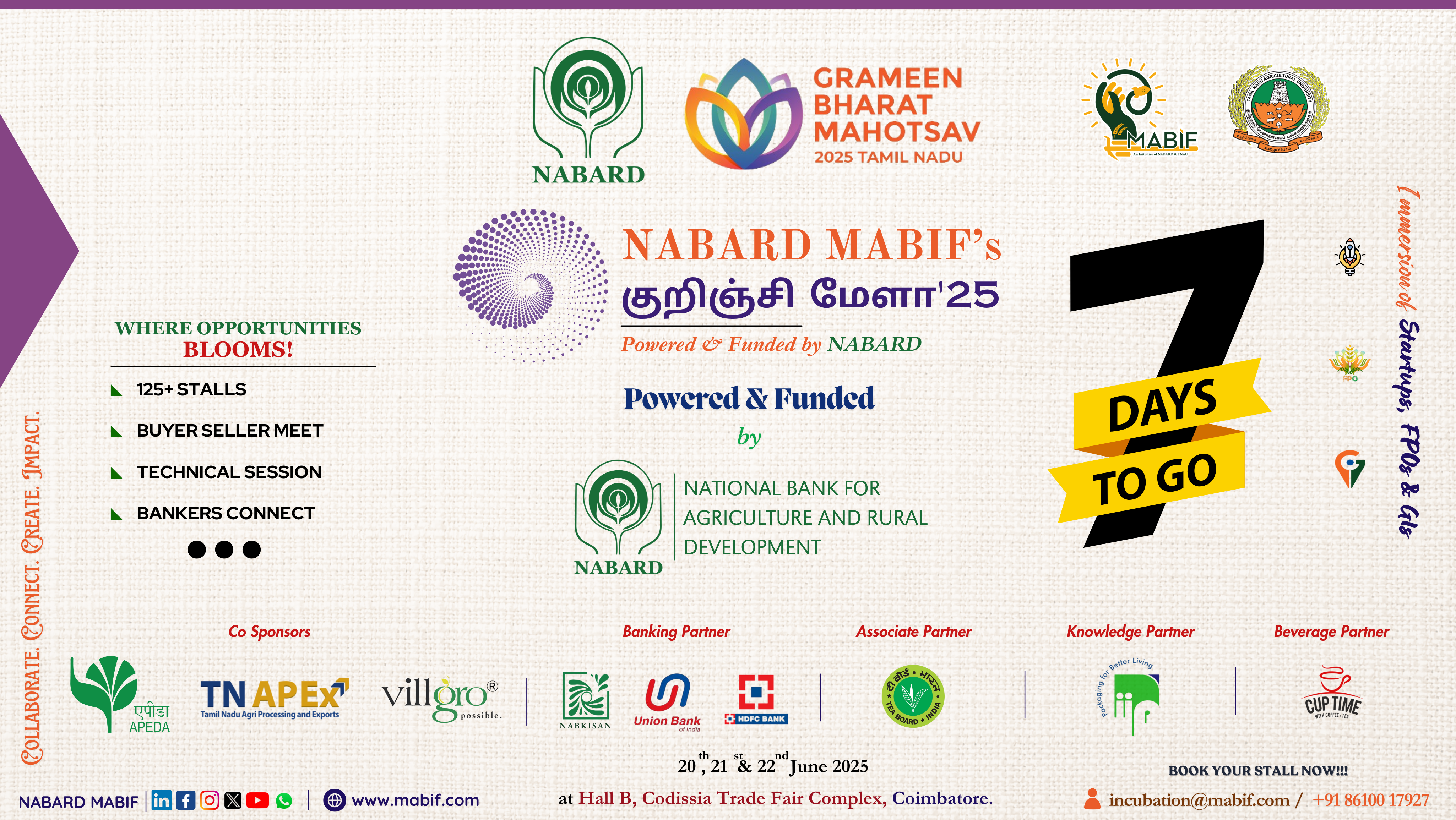 Join us for “Grameen Bharat Mahotsav’ 2025 (குறிஞ்சி மேளா – 2025)” organized by NABARD – National Bank for Agriculture and Rural Development in association with NABARD MABIF. This grand 3-days event is scheduled to take place from 20th – 22nd June 2025 at Hall B, Codissia Trade Fair Complex, Coimbatore.