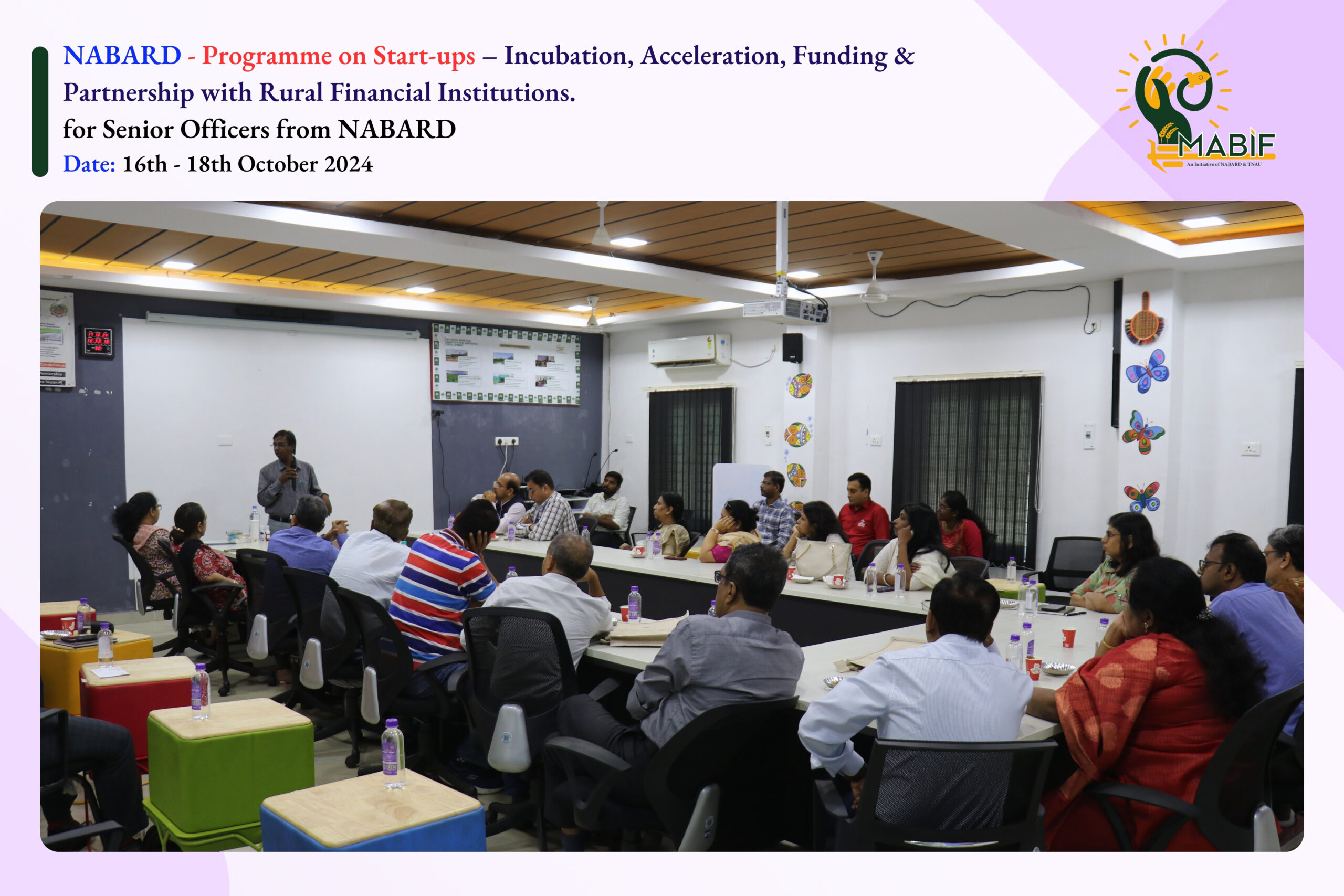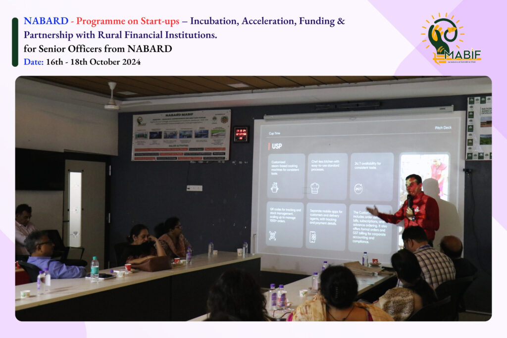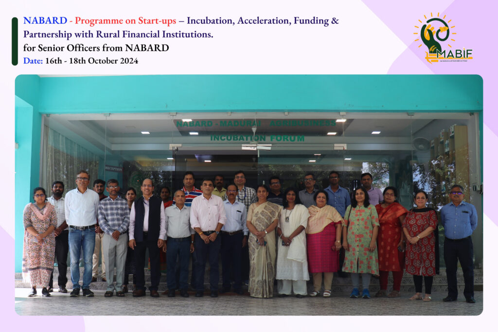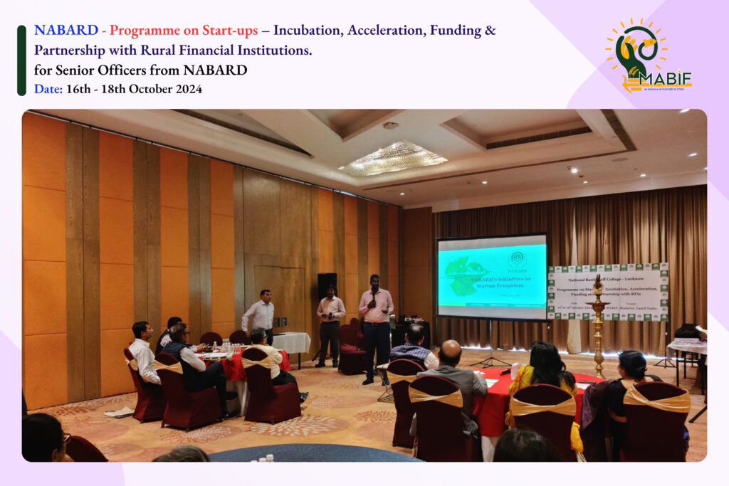 National Bank Staff College’s Training Programme on Start-ups – Incubation, Acceleration, Funding & Partnership with Rural Financial Institutions. This program was organized for senior officers from NABARD and included insightful discussions led by startup ecosystem experts on fostering innovation and supporting rural financial institutions. Held from 16th to 18th October 2024, at Madurai.