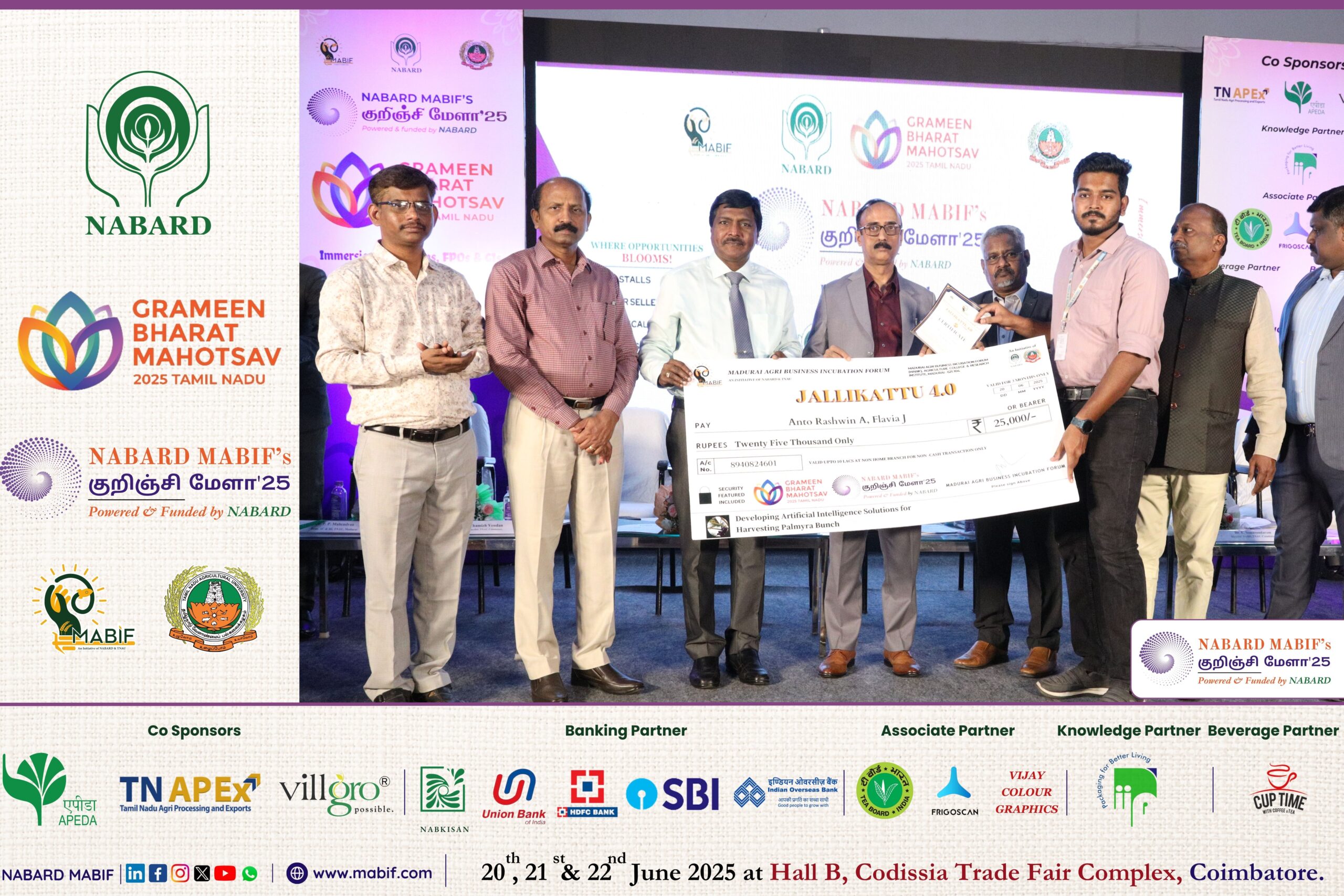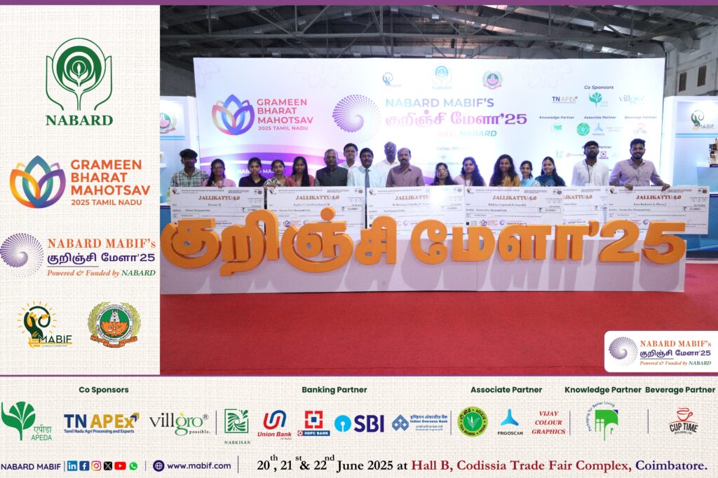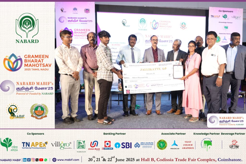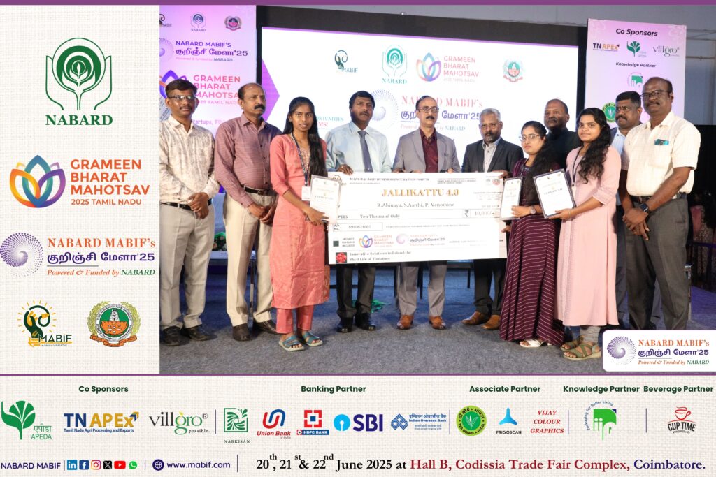 We are delighted to share that the winners of NABARD MABIF’s Jallikattu 4.0, an inter-college student entrepreneurship ideathon, were honoured with cash prizes worth ₹2,00,000 during the Grameen Bharat Mahotsav 2025 (குறிஞ்சி மேளா ’25) held on 20th June 2025 at Hall B, Codissia Trade Fair Complex, Coimbatore.