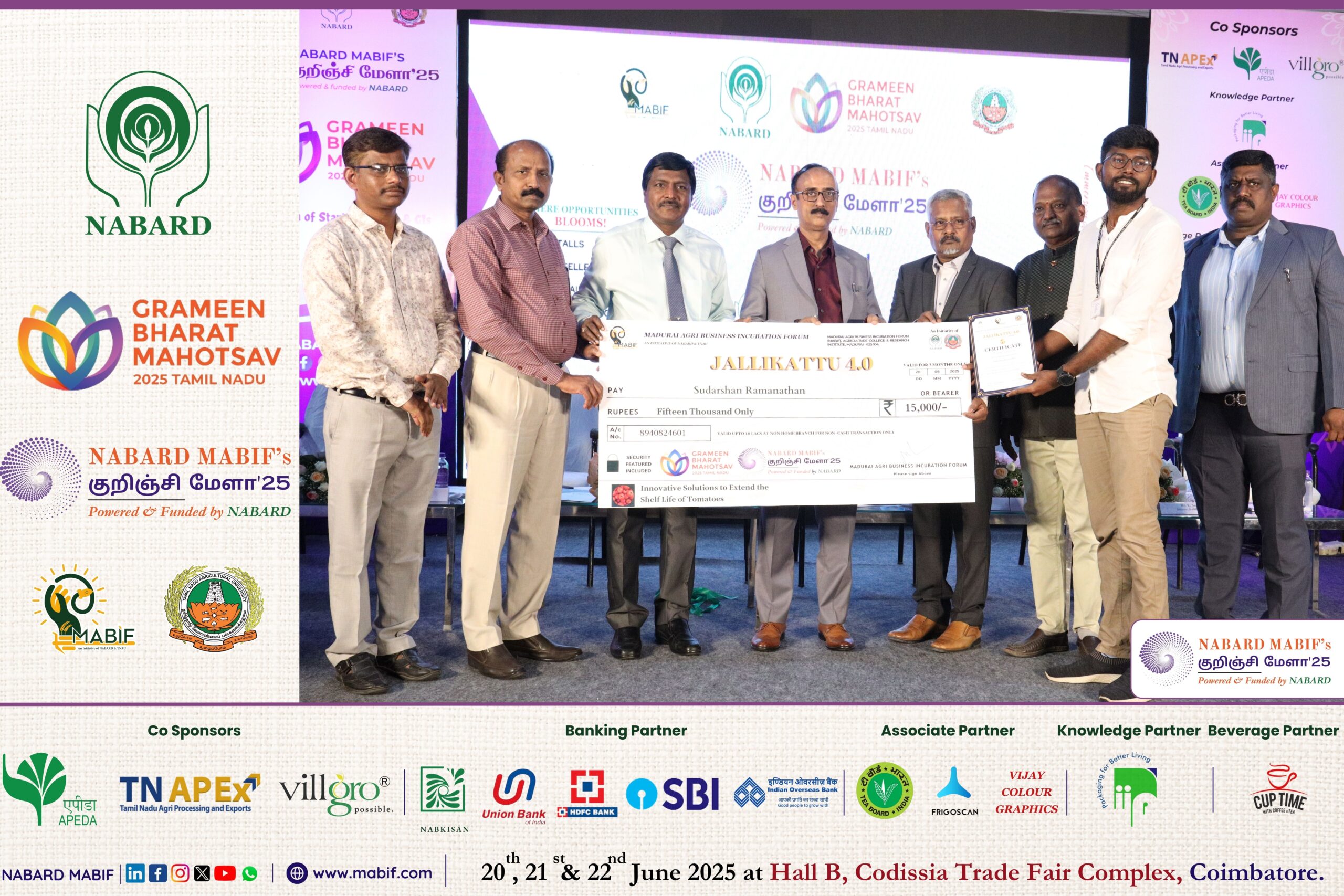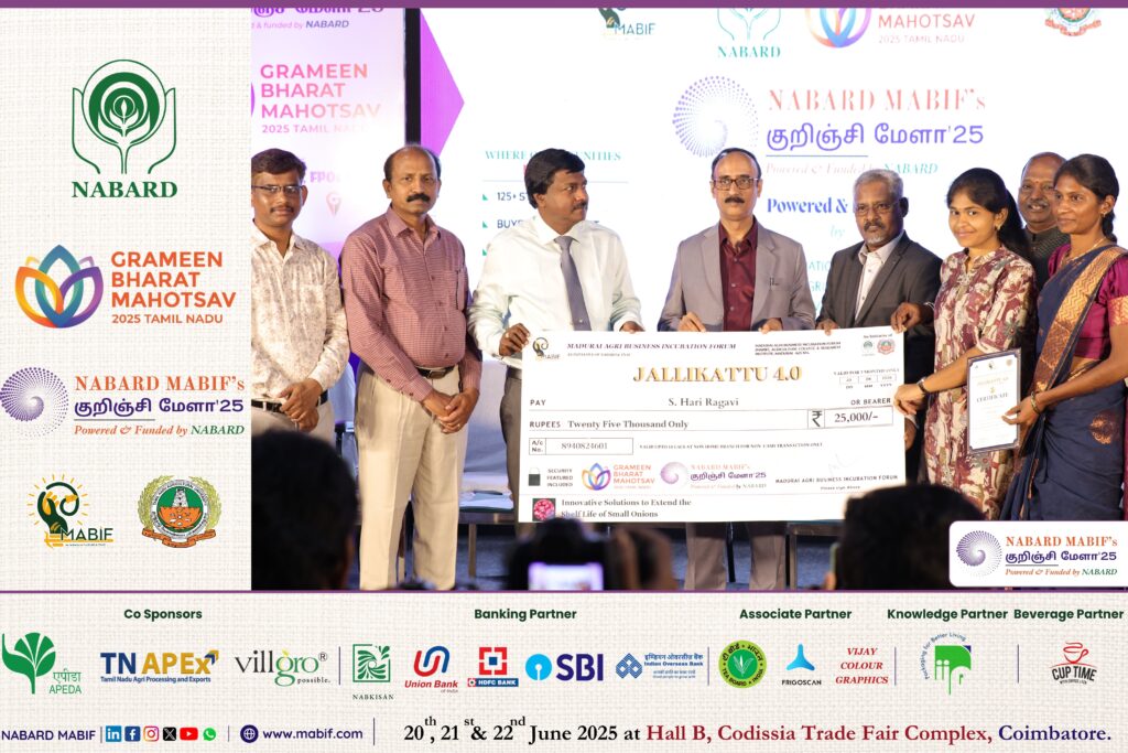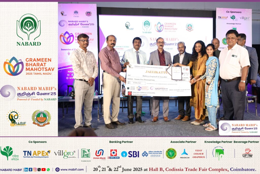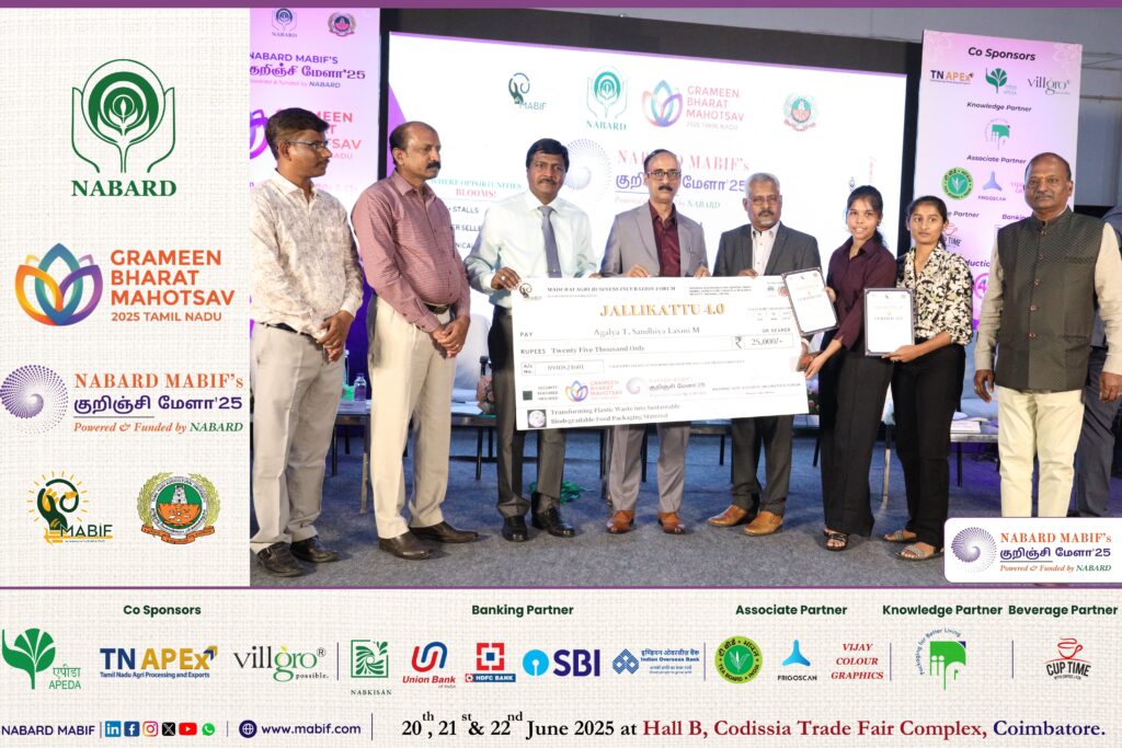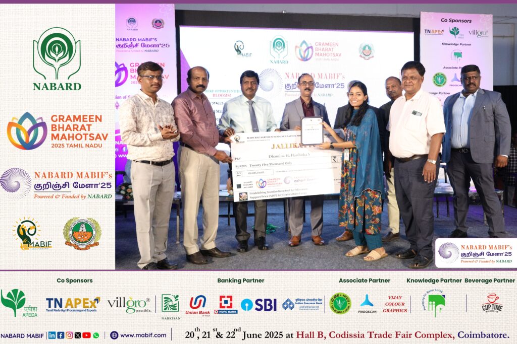 We are delighted to share that the winners of NABARD MABIF’s Jallikattu 4.0, an inter-college student entrepreneurship ideathon, were honoured with cash prizes worth ₹2,00,000 during the Grameen Bharat Mahotsav 2025 (குறிஞ்சி மேளா ’25) held on 20th June 2025 at Hall B, Codissia Trade Fair Complex, Coimbatore.